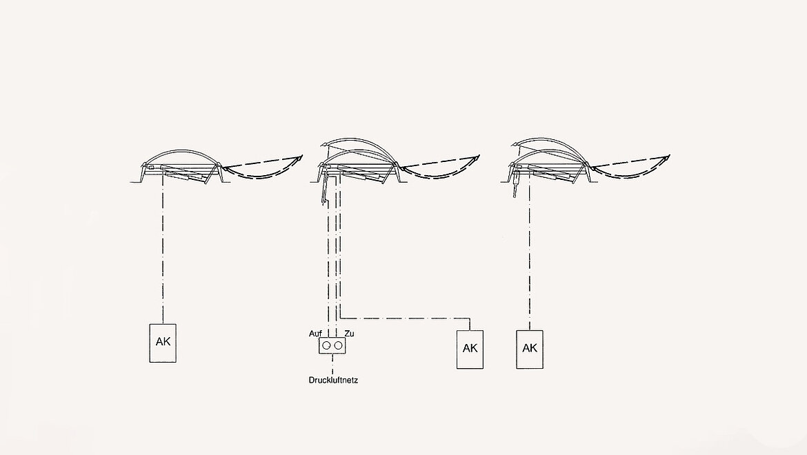 - Fonction ECF au choix, ouverture seulement ou ouvert/fermé : La fonction optionnelle de fermeture sert à fermer par pneumatique en toute simplicité après un essai de fonctionnement ou un déclenchement non souhaité via le boîtier de l’alarme. Avantage : les coupoles n’ont plus besoin d’être fermées par le toit, ce qui facilite la manipulation. Les fonctions d’ECF l’exutoire de fumées Système CI peuvent ainsi être testées confortablement à intervalles réguliers par le biais du boîtier d’alarme.